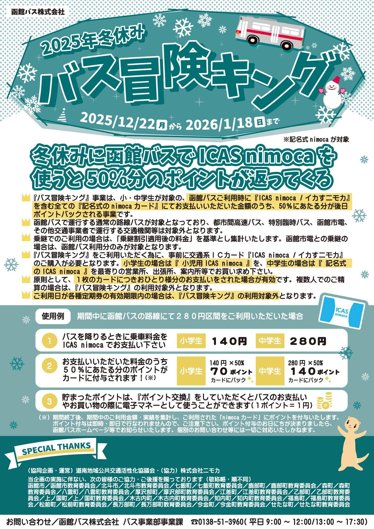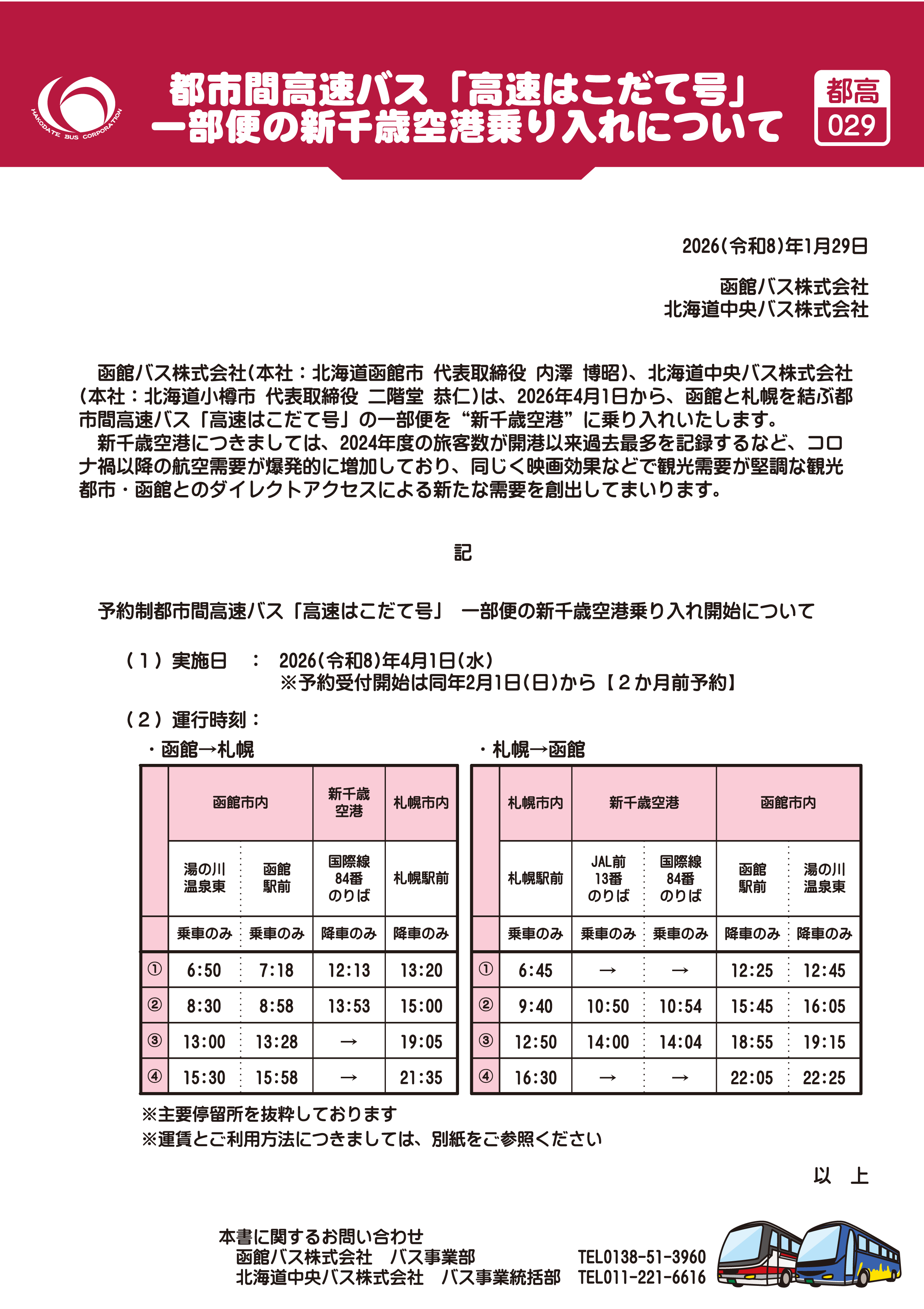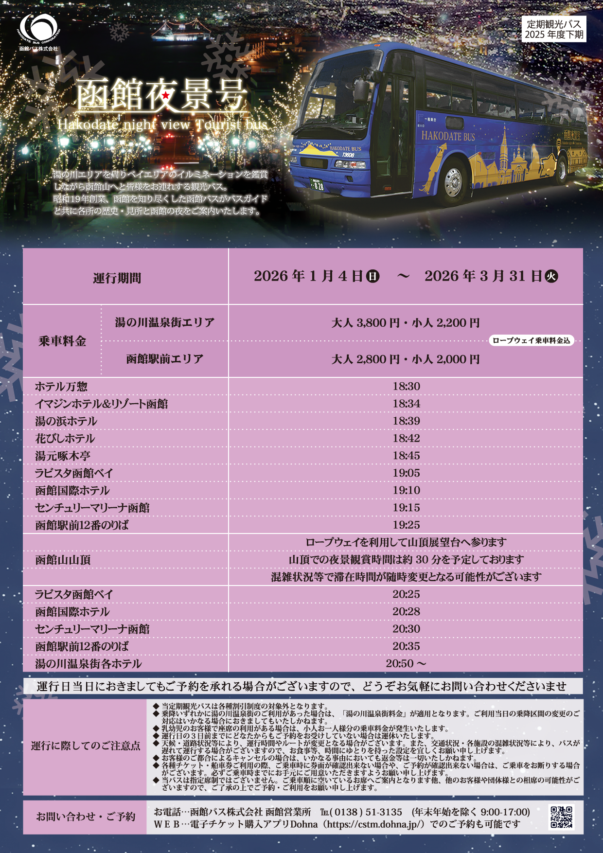 ご予約先…函館バス株式会社 函館営業所 ☎0138-51-3135(年末年始を除く9:00~17:00)
