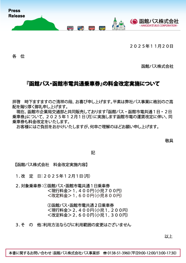 函館市企業局交通部(函館市電)と共同販売しております『函館バス・函館市電共通乗車券』につきまして、2025年12月1日(月)に実施される函館市電の運賃改定に伴いまして、下記のとおり料金改定を実施いたします。