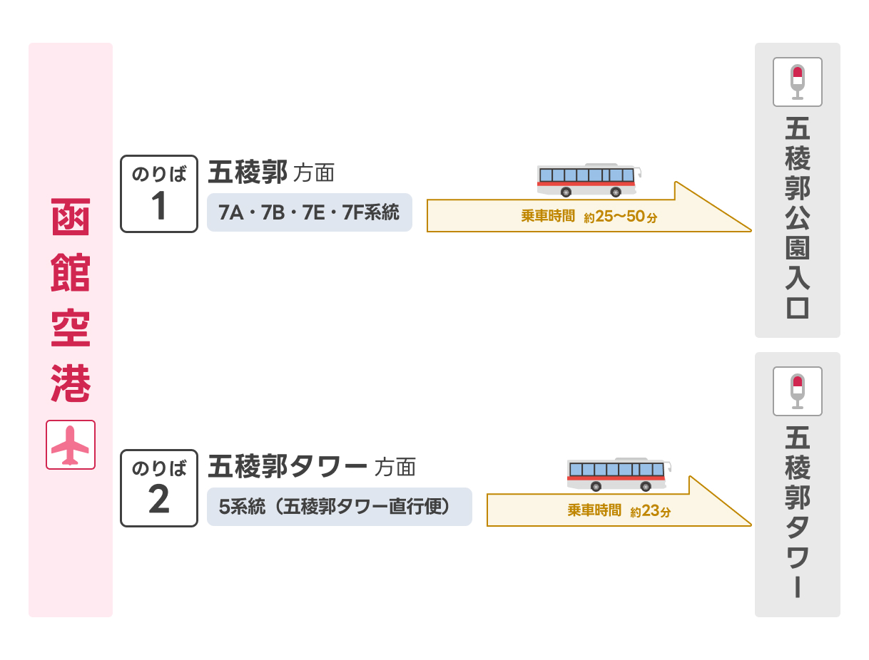 | 函館空港 | 五稜郭公園入口 | 1番のりば | 7A・7B系統 | 25~30分 |