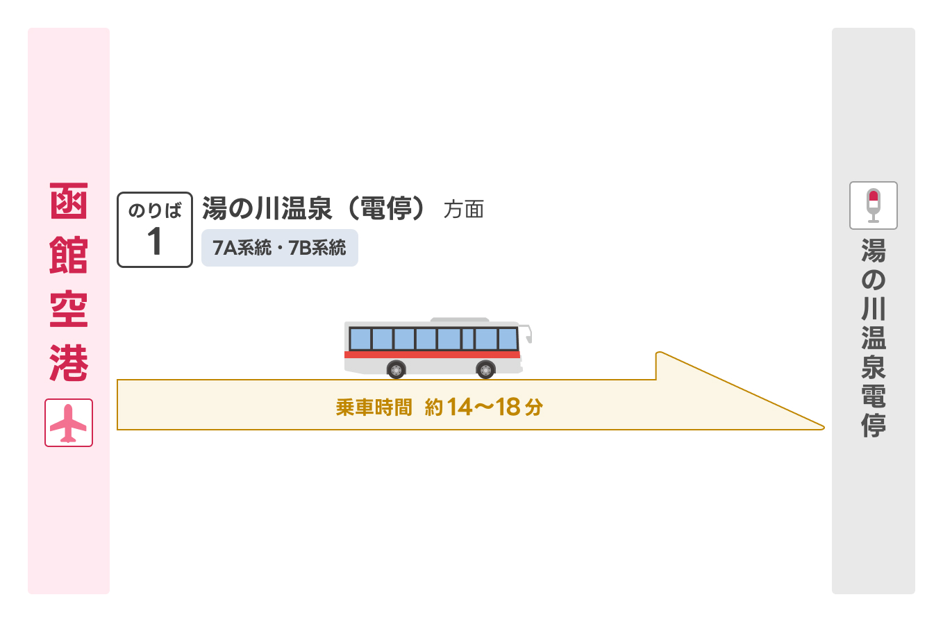 | 函館空港 | 湯の川温泉電停 | 1番のりば | 7A・7B系統 | 14~18分 |