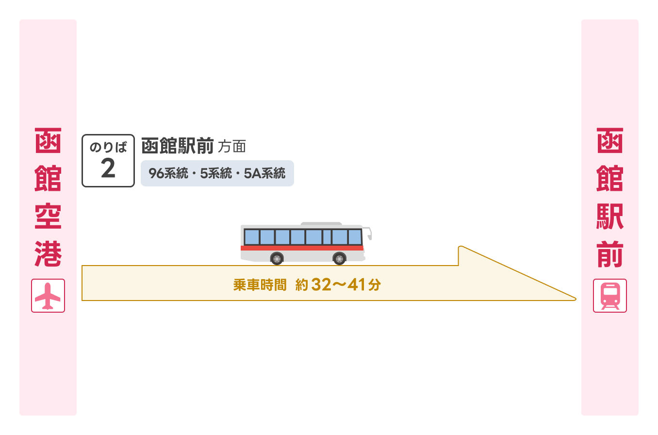| 函館空港 | 函館駅前 | 2番のりば | 96系統 | 32分 |